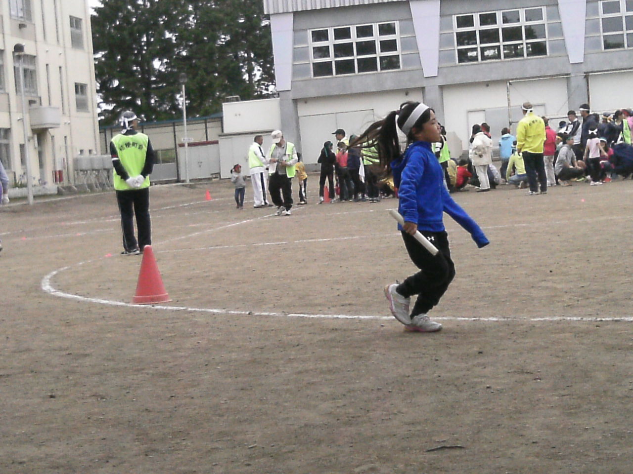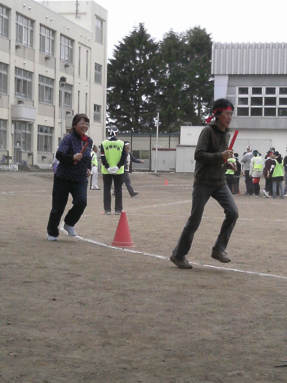 紅白全員リレー 走れる人はみんな出てください。グランドをみんな1周。みなさん年齢相応に無理せず走っていました。