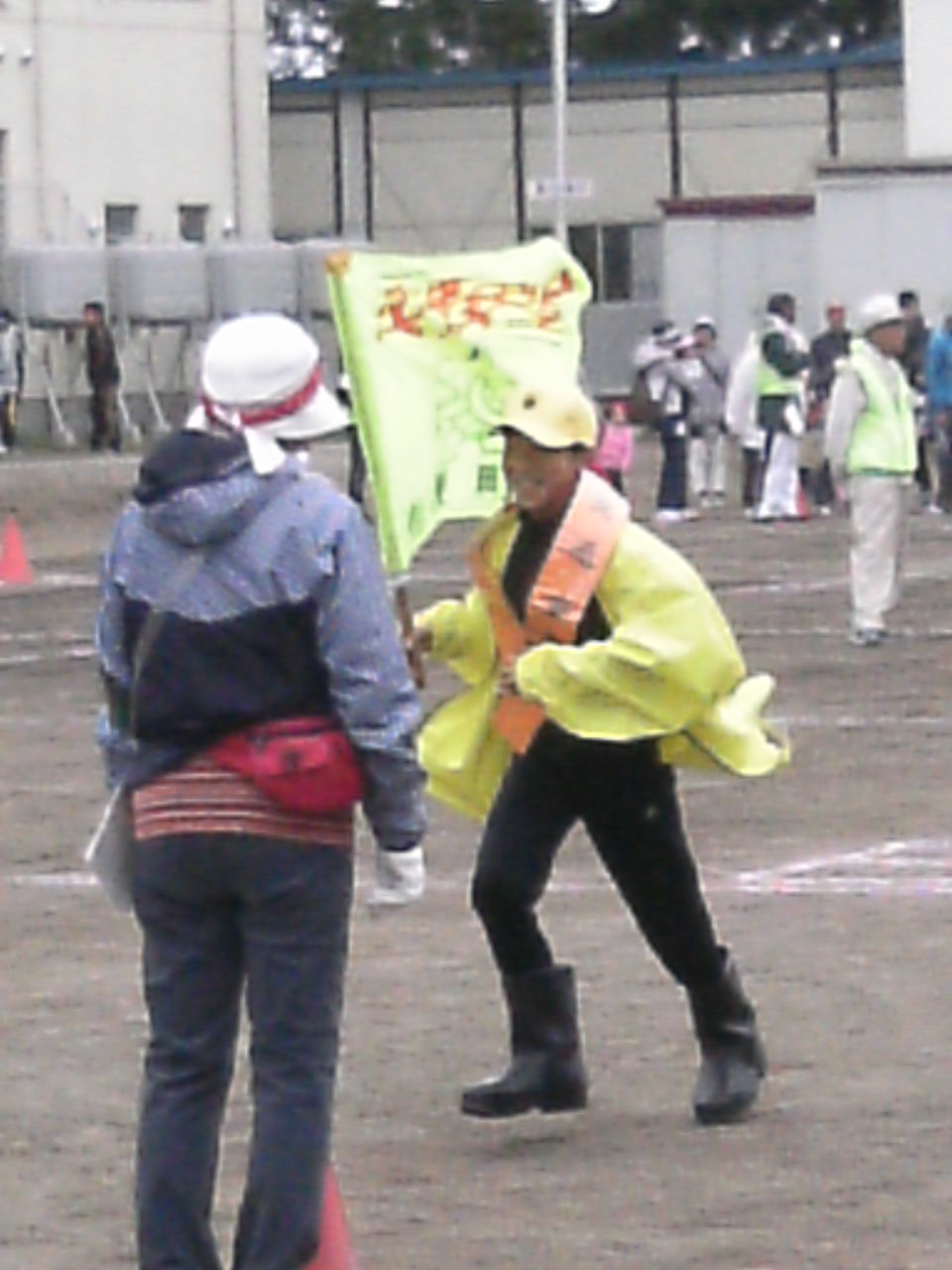 半纏(はんてん)長靴 たすき で 交通安全旗 をリレー
