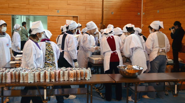 炊き出し訓練では、地元の女性ボランティアの方たちがおにぎりを握って協力、自衛隊の給水車も到着し給水開始、その水で非常食のアルファ米を作って、ミネラルウォーターと一緒に配布。
