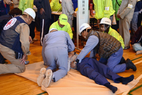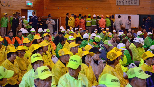 今年で第3回目となる「住民参加型」防災総合訓練で、地震による津波が発生した災害を想定し、警報で石崎小学校体育館に避難してきた住民による、避難訓練、炊き出し訓練、避難所設置訓練、災害ボランティア受付訓練など、総勢345名が参加して行われました。