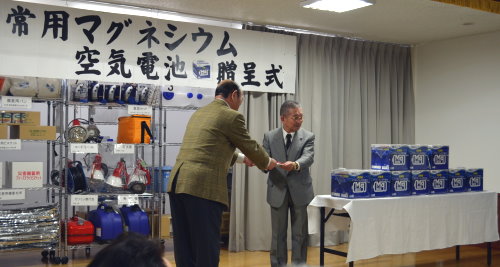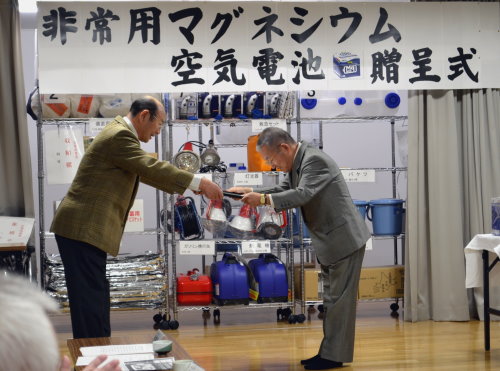 1月27日(火)午後6時、「非常用マグネシウム空気電池贈呈式」が桔梗町会館大広間で行われました。この日非常用マグネシウム空気電池10個を函館市西桔梗町 輪島電装株式会社(代表取締役 輪島一郎)様から贈呈されました。輪島社長自ら目録と空気電池10個が手渡され、桔梗町会を代表して佐藤会長がお礼の言葉と感謝状を渡しました。