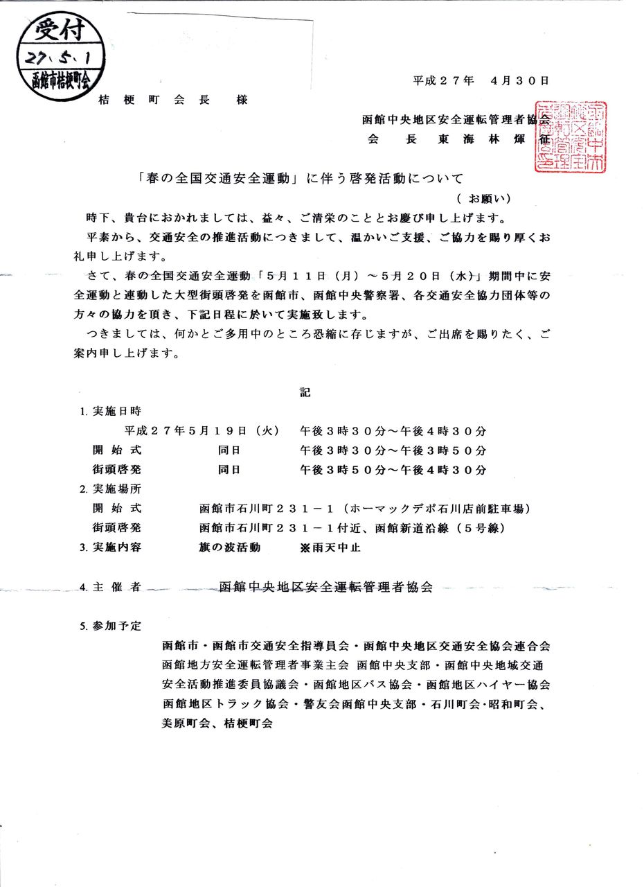 2015年05月13日 5月19日 地元で「旗の波」活動・会員の参加をお待ちしてます 地元で「春の全国交通安全」に伴う街頭啓発活動が行われます桔梗町会も、参加協力いたします実施日時:平成27年5月19日(火) 15:30 ~ 16:30実施場所:函館市石川町231-1 ホーマック石川店駐車場主催者 :函館中央地区安全運転管理者協会上記の時間に参加頂ける方は、5/16(土)まで、加藤(47-1167)か桔梗町会館(46-8848)までご連絡を下さい タグ :#ホーマックデポ#石川町#函館新道#春#交通安全#旗の波 「交通安全部」カテゴリの最新記事 < 前の記事次の記事 > コメント コメントフォーム 名前 コメント 記事の評価 リセット リセット 顔 星 情報を記憶 コメントを投稿する