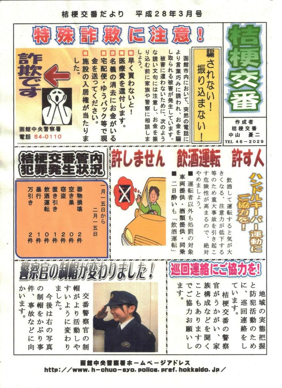 2016年03月23日 「桔梗交番」からのお知らせ!! 「桔梗交番だより」が届きました季節の変わり目です、何かと変わった事が多くなります 特殊詐欺 に注意!! 飲酒運転 に注意!! 「交通安全部」カテゴリの最新記事 < 前の記事次の記事 > コメント コメントフォーム 名前 コメント 記事の評価 リセット リセット 顔 星 情報を記憶 コメントを投稿する