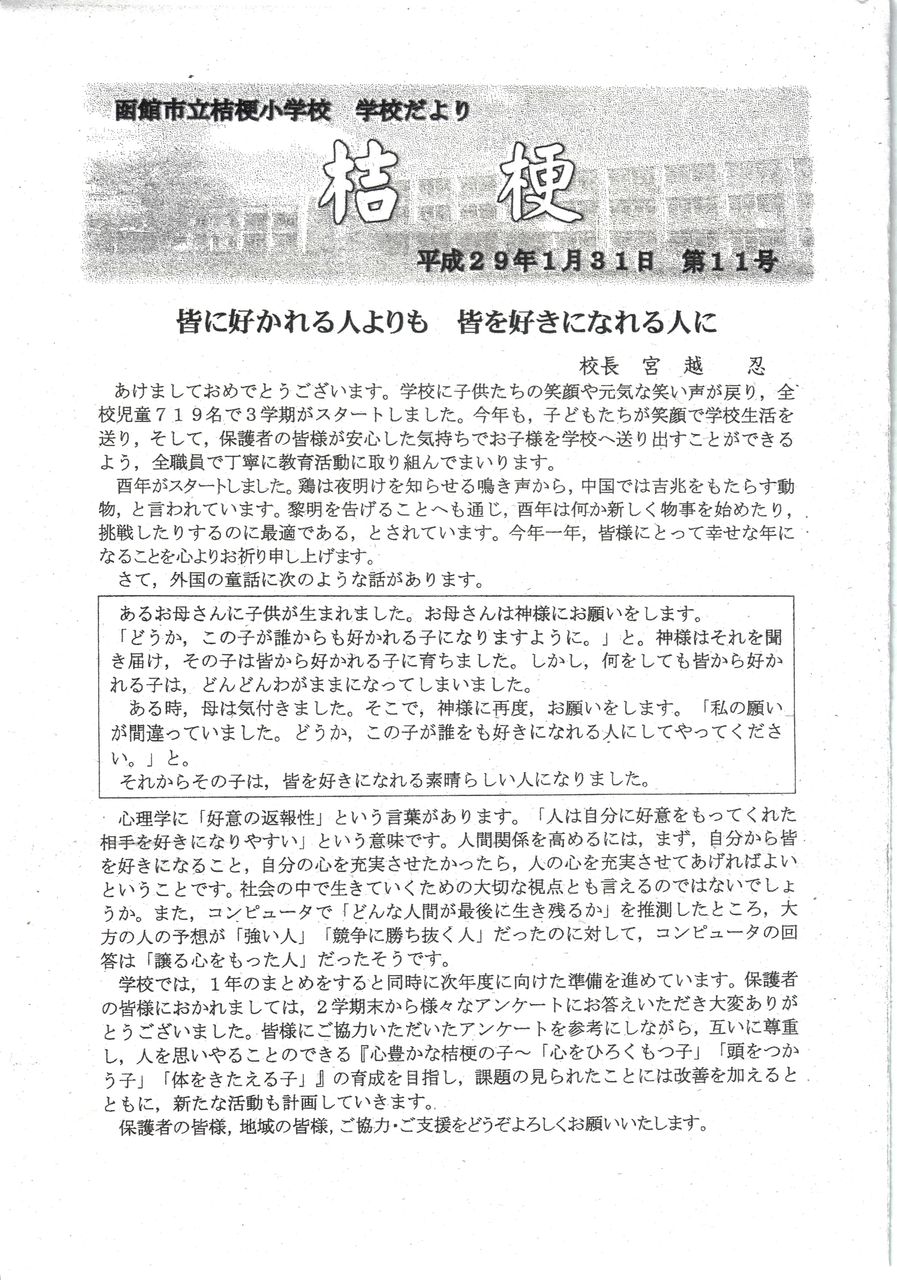 2017年02月15日 「桔梗小学校だより」です 遅くなりましたが、「桔梗小学校だより」を掲載します近所の小学生を見守る情報として、ご利用下さい(k&k&k) 「広報部」カテゴリの最新記事 < 前の記事次の記事 > コメント コメントフォーム 名前 コメント 記事の評価 リセット リセット 顔 星 情報を記憶 コメントを投稿する