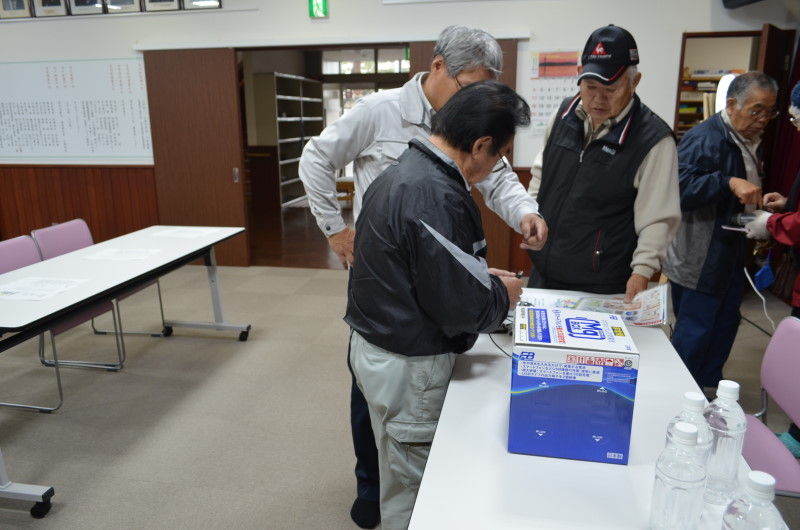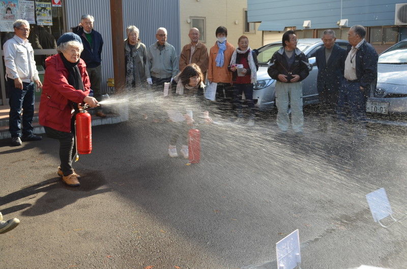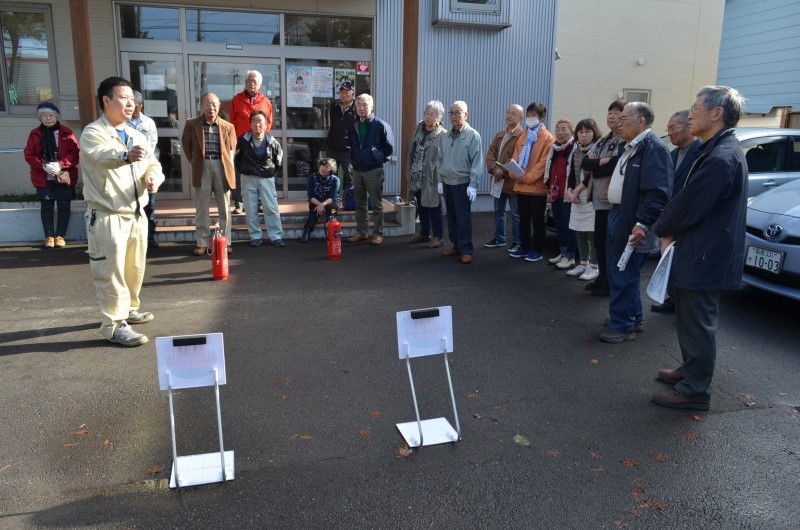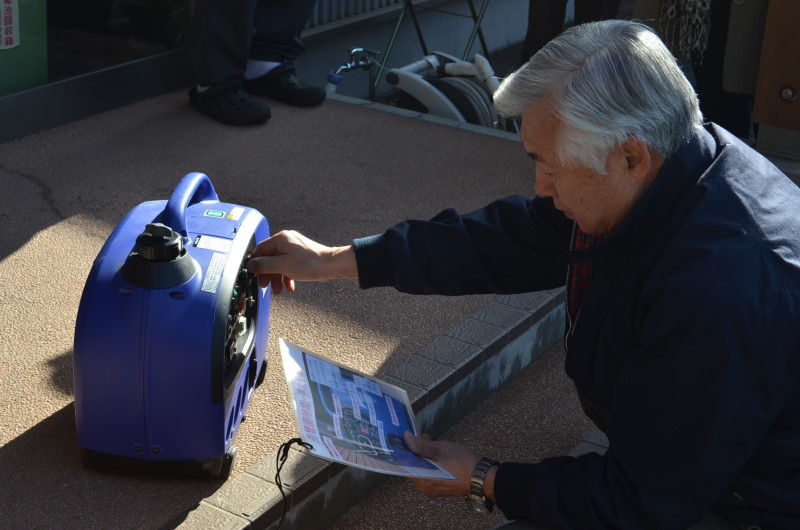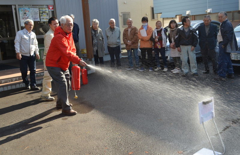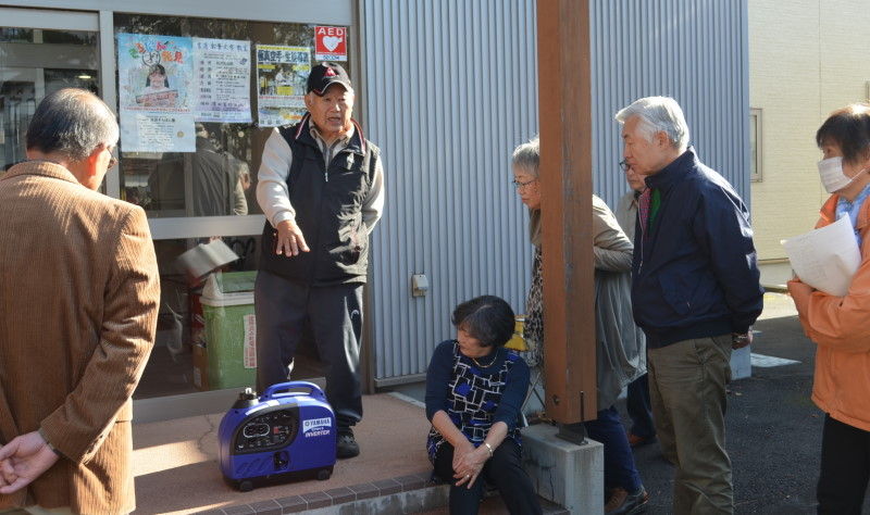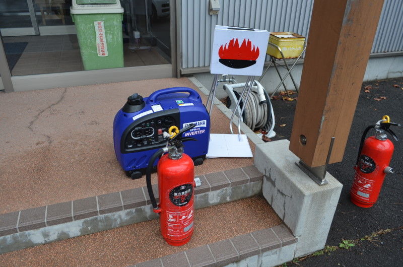 である。その後、会館外で消火器の使用方法の確認と消火を体験した。会館で常備している自主防災備品の紹介、手回し発電と2台ある発電機の稼動
