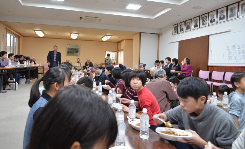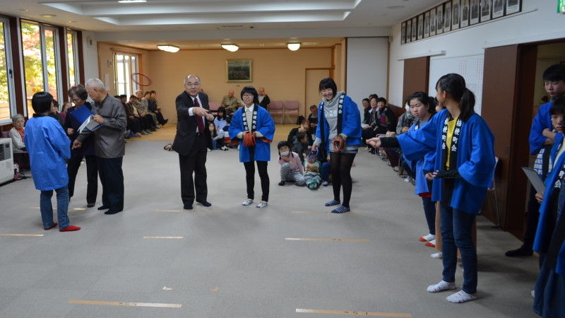今回の主な行事は、最初、函館名物イカ踊り体操で身体をほぐし、年齢別の輪投げゲーム、みんなで歌を歌おう、そして昼食の美味しいカレーをいた