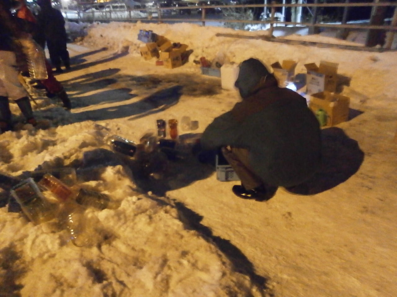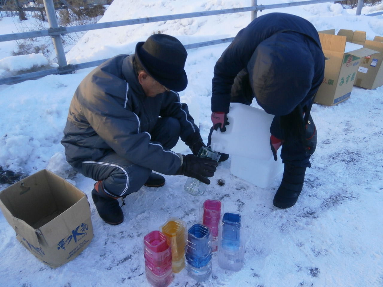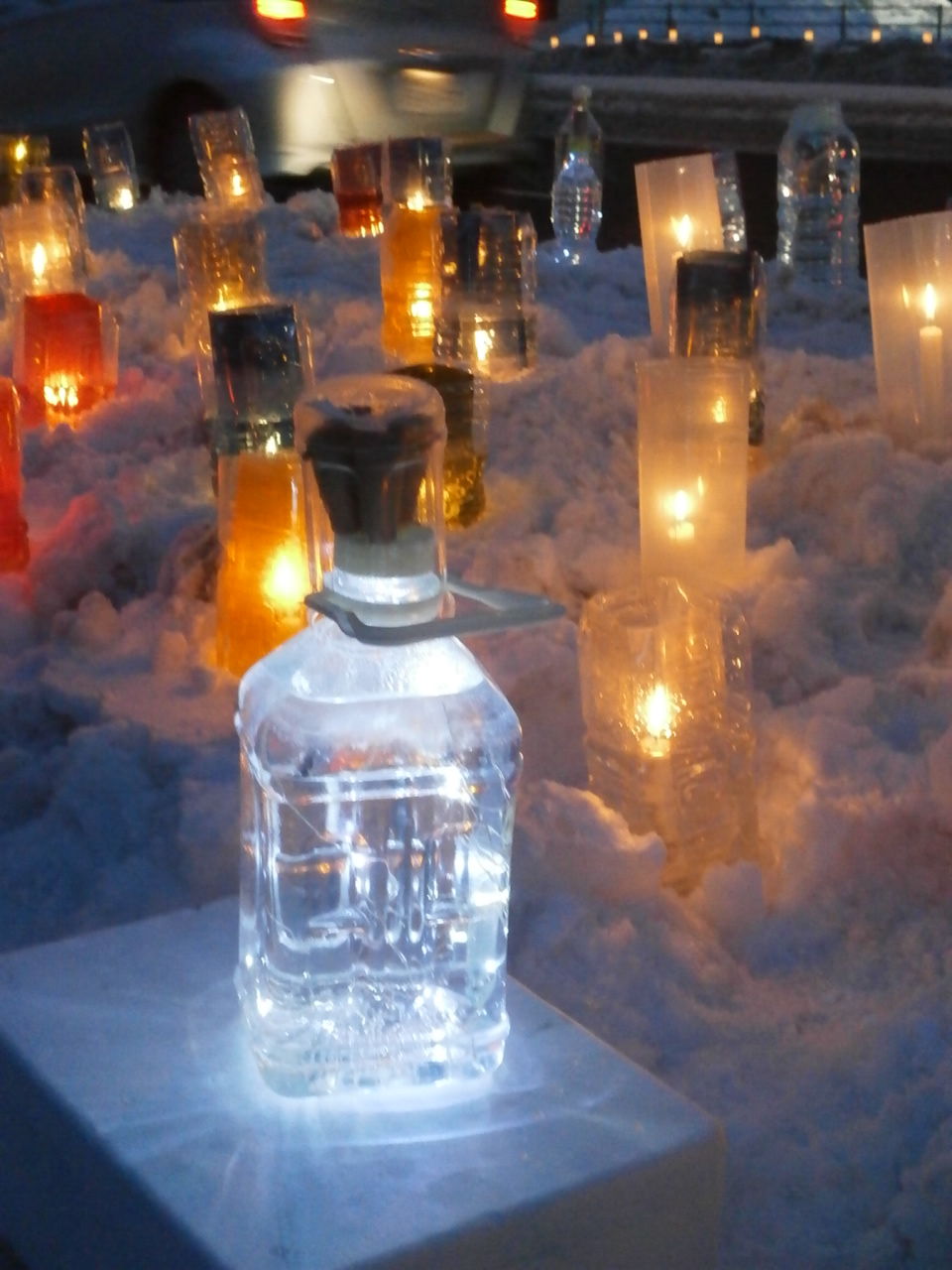 桔梗町会は、ホーマック付近の一角で、ペットボトルを組み合わせ、ろうそくを入れたキャンドルフォルダーを作成した。水を入れると、凍りきれいに。またペットボトルがろうそくの熱で溶けない