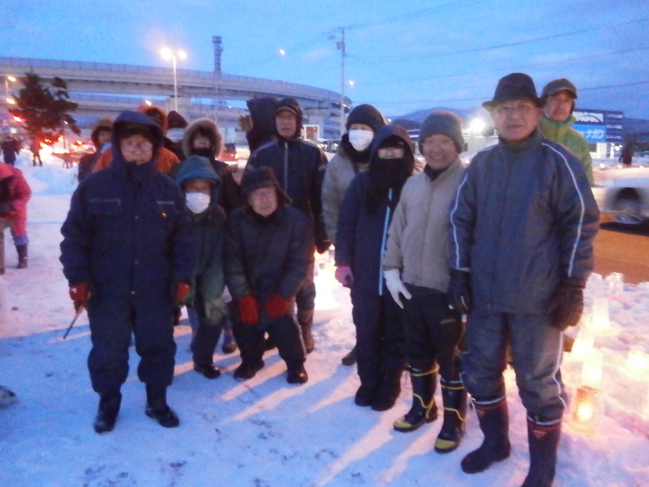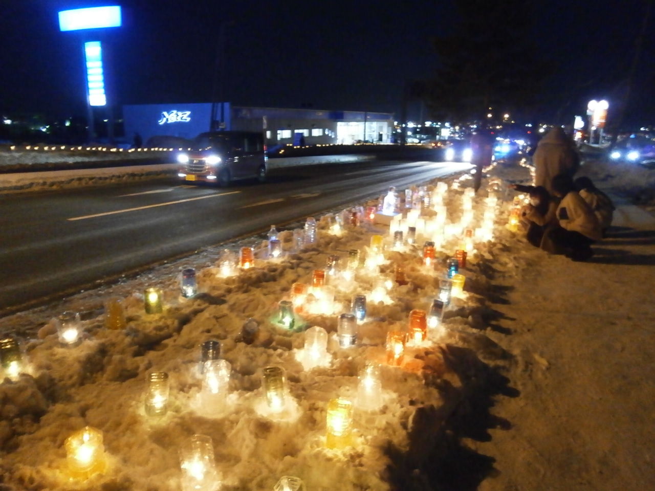 石川会場では、近隣の4町会関係者の他、少年野球団や稜北高校生など約500人が、新道の両側に1700箇のキャンドルを設置した。