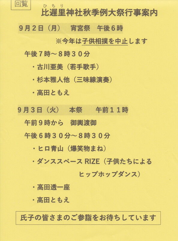 比遅里神社秋季例大祭、9月2日(月)午後6時より宵宮祭。