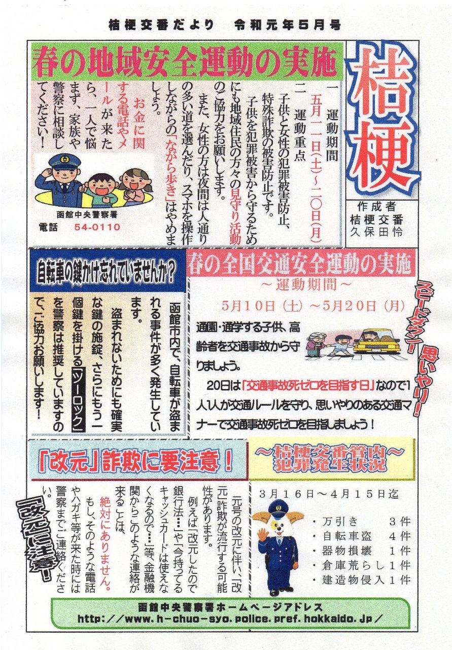 2019年04月30日 「桔梗交番情報 5月号」が寄せられました 「飲酒運転をしない、させない、許さない」 ◎「春の地域安全運動」!! ◎「春の全国交通安全運動」!! ◎「自転車の鍵」!! ◎「「改元」詐欺」に注意!! (k&k&k) 「広報部」カテゴリの最新記事 < 前の記事次の記事 > コメント コメントフォーム 名前 コメント 記事の評価 リセット リセット 顔 星 情報を記憶 コメントを投稿する