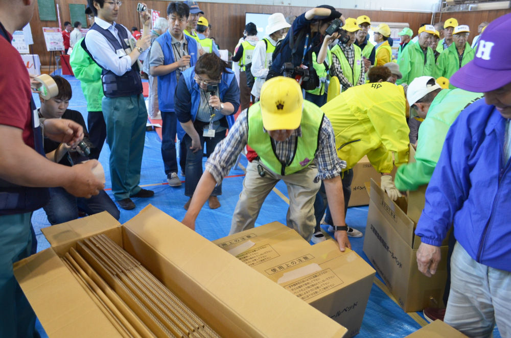 支援物資受け入れ、ダンボールベッド作成訓練、応急手当、非常