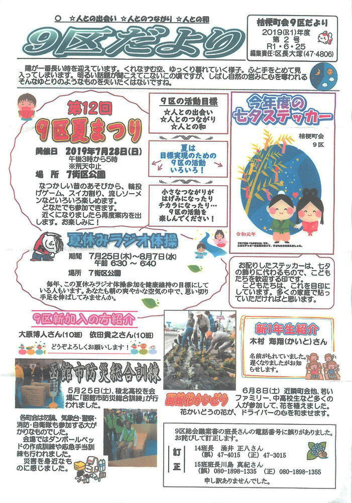 2019年07月07日 桔梗町会第9区だより・令和元年度第2号発行 第12回「9区夏まつり」や「夏休みラジオ体操」の案内や七夕ステッカーの配布、9区に新規加入した会員さんの紹介などの記事が掲載されています。 タグ :#函館市#桔梗町会#9区#たより#七夕ステッカー#夏まつり#ラジオ体操#新規加入#会員#紹介 「広報部」カテゴリの最新記事 < 前の記事次の記事 > コメント コメントフォーム 名前 コメント 記事の評価 リセット リセット 顔 星 情報を記憶 コメントを投稿する