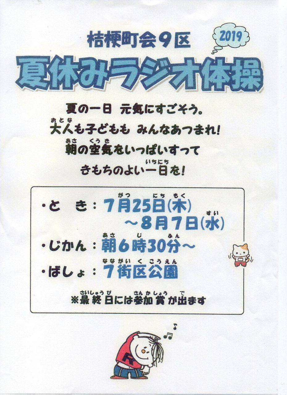 2019年07月18日 桔梗9区「夏休みラジオ体操」と「夏祭り」 桔梗9区「夏休みラジオ体操」と「夏祭り」 さあ、夏休みが始まります 桔梗9区では恒例の行事です「夏休みラジオ体操会」は7月25日(木)から8月7日(水)朝6時30分行われます2週間ですよ!! 自由参加です「夏祭り」は7月28日(日)午後3時~5時に行われます (k&k&k) 「各区の行事など」カテゴリの最新記事 < 前の記事次の記事 > コメント コメントフォーム 名前 コメント 記事の評価 リセット リセット 顔 星 情報を記憶 コメントを投稿する