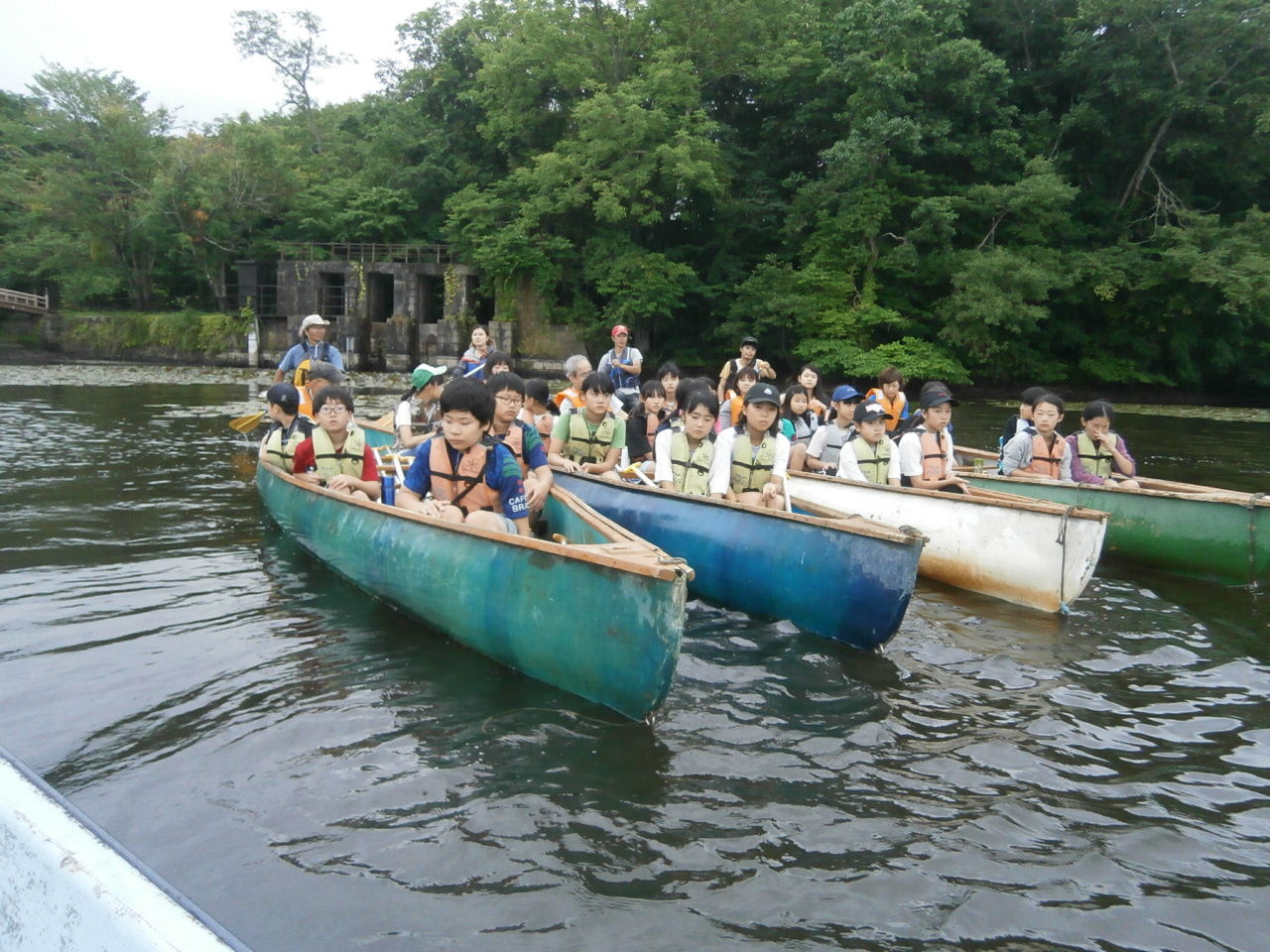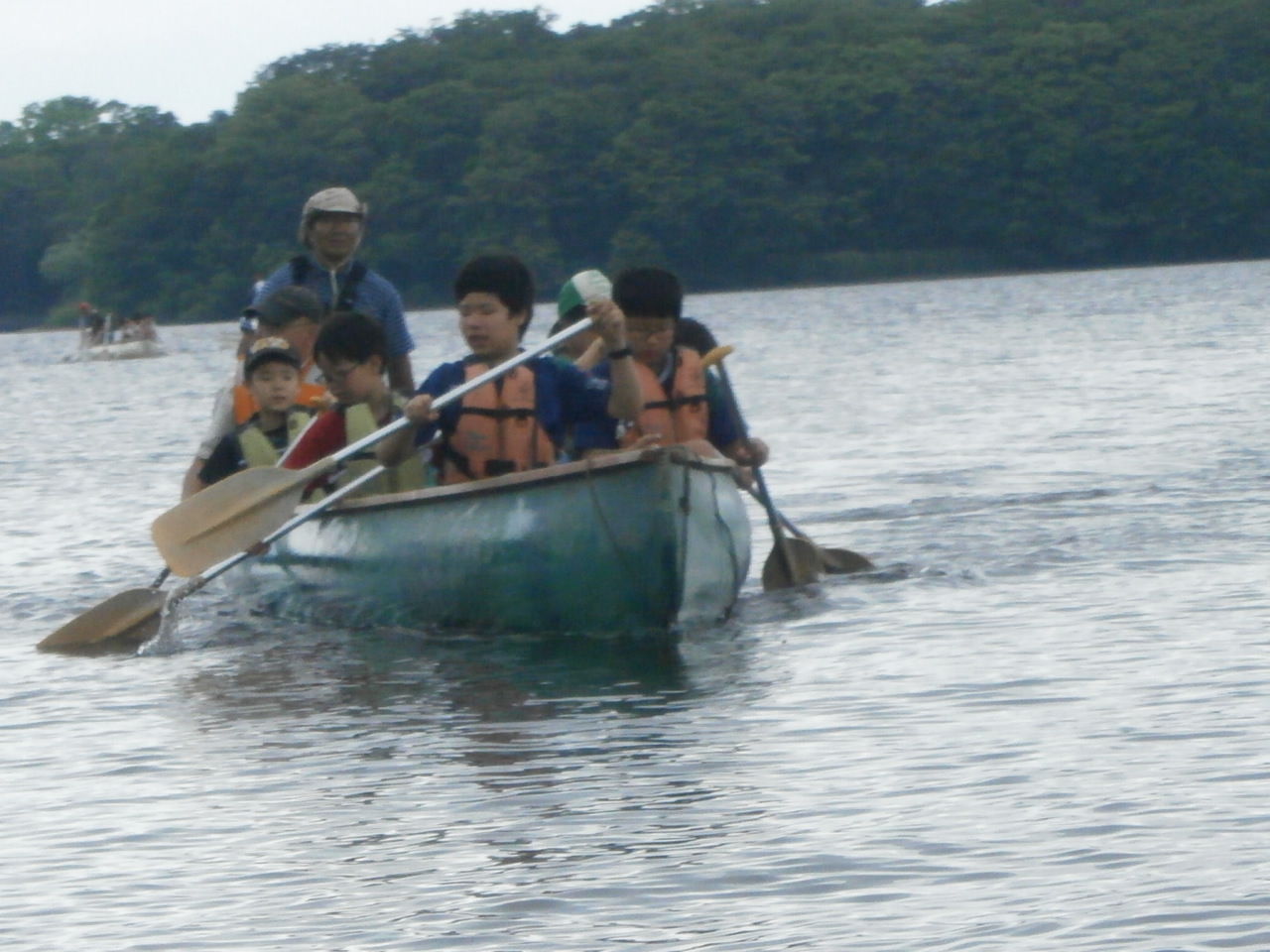 大沼は、やや波があったが、声を合わせてパドルを漕ぎ、中央の島までを往復した。そのチームワークは夜の自己紹介ゲームなどで発揮された。