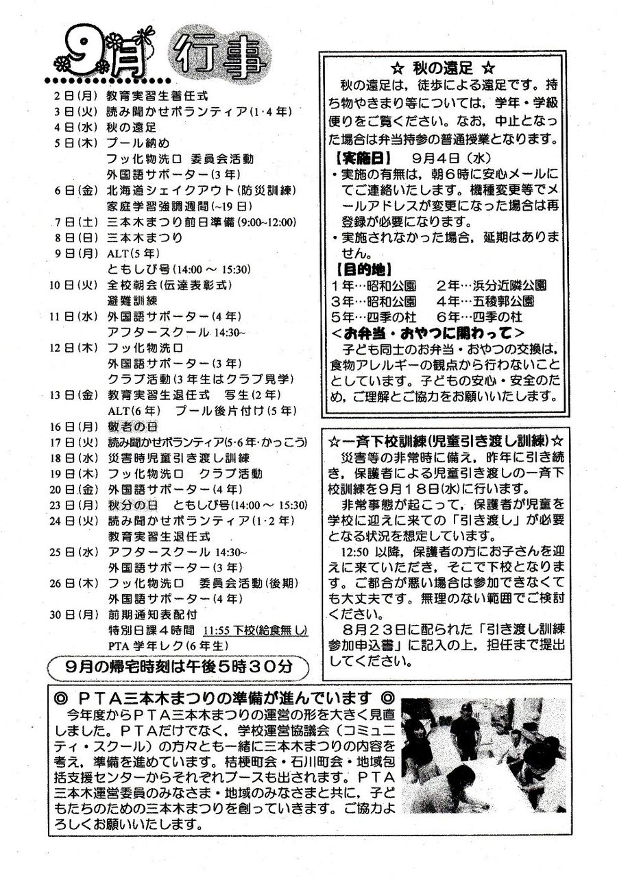 2019年09月13日 20190913 「桔梗小学校だより」 「桔梗小学校だより」です子供たちを暖かく、見守りましょう!!「9月の帰宅時間は、午後5時30分」です (k&k&k) 「広報部」カテゴリの最新記事 < 前の記事次の記事 > コメント コメントフォーム 名前 コメント 記事の評価 リセット リセット 顔 星 情報を記憶 コメントを投稿する