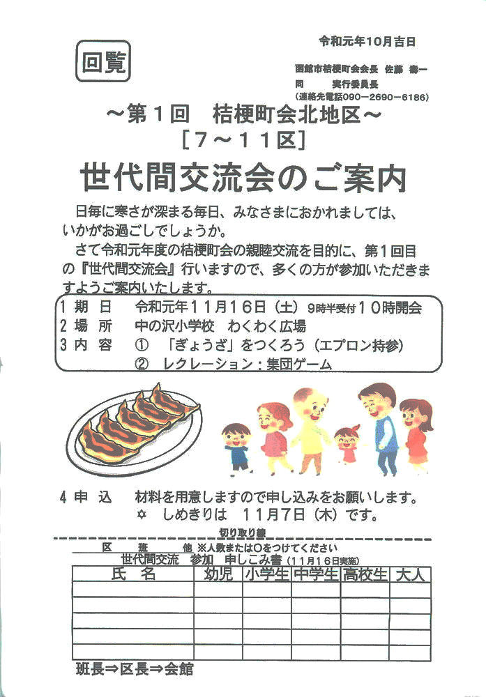 2019年11月02日 11月16日・ぎょうざを作ろう!中の沢小学校 11月16日(土)世代間交流会(北会場)を開催します。 午前9時30分から受付で10時開催「中の沢小学校・わくわく広場で」で手作り餃子作りに挑戦してもらいます。他に参加した皆さんとゲームを行います。参加は桔梗町会第7区から第11区に住んでいる方が対象です。詳細は回覧済の下記チラシをご参照ください。 タグ :#世代間#交流#ゲーム#中の沢小学校#ぎょうざ#餃子#手作り#函館市#桔梗町会 「広報部」カテゴリの最新記事 < 前の記事次の記事 > コメント コメントフォーム 名前 コメント 記事の評価 リセット リセット 顔 星 情報を記憶 コメントを投稿する