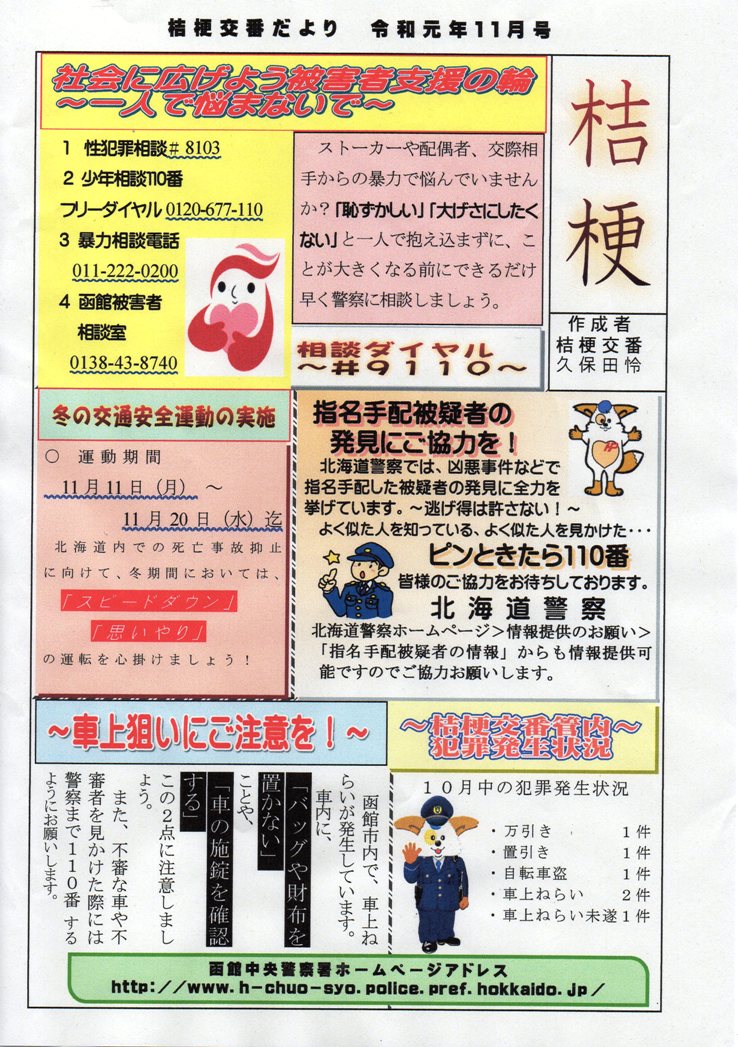 2019年11月01日 「桔梗交番だより 11月号」が寄せられました 「冬秋の交通安全運動」が11/11~11/20に実施されます ◎「スピードダウン」! ◎「車上狙いにご注意」 函館市内でも、 車上狙いが多発しています!車内に、物を置かない事が重要です!! 「交通安全部」カテゴリの最新記事 < 前の記事次の記事 > コメント コメントフォーム 名前 コメント 記事の評価 リセット リセット 顔 星 情報を記憶 コメントを投稿する