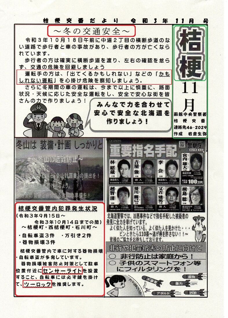2021年11月03日 「桔梗交番だより 11月号」が寄せられました 日没時間が、早くなりましたので 事故防止のため、心掛けましょう!!◎歩行者は「反射テープや目立つ服装!!」◎運転者は「かもしれない運転!!」 「交通安全部」カテゴリの最新記事 < 前の記事次の記事 > コメント コメントフォーム 名前 コメント 記事の評価 リセット リセット 顔 星 情報を記憶 コメントを投稿する