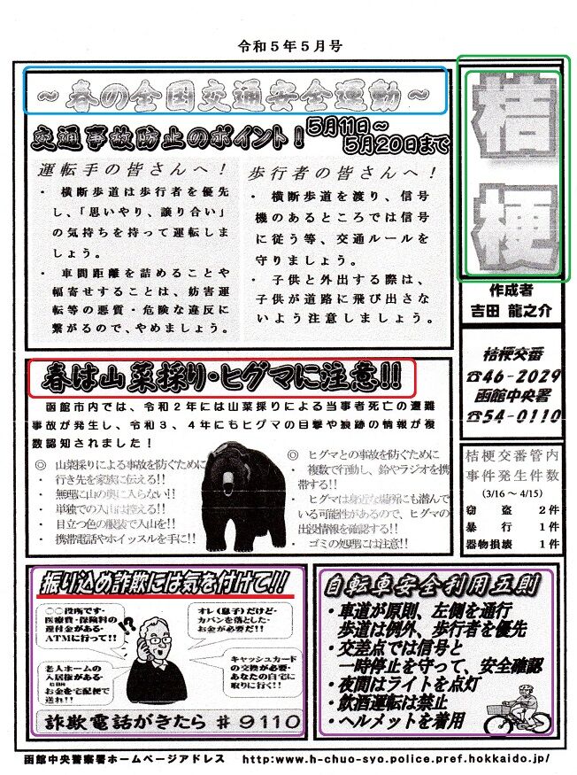 2023年05月05日 「桔梗交番だより 5月号」(2023-05-05)が寄せられました 「桔梗交番だより 5月号」(2023-05-05)が寄せられました◎「~春の全国交通安全運動~」◎「山菜採り・ヒグマに注意!!」◎「振り込め詐欺に気を付けて!!」◎「自転車安全利用!!」 「交通安全部」カテゴリの最新記事 < 前の記事次の記事 > コメント コメントフォーム 名前 コメント 記事の評価 リセット リセット 顔 星 情報を記憶 コメントを投稿する