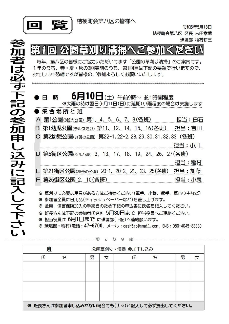 2023年05月22日 桔梗町会八区の公園草刈り清掃の案内 桔梗町会八区(吉田孝蔵区長)では6月10日(土)区内にある6か所の公園草刈り清掃を行います。 各公園の地域会員の皆さんに参加していただき、午前9時から一斉に実施します。 参加の方は、下記回覧の通り「申込書」に記入し5月30日までに担当役員に提出してして下さい。 尚、雨天の場合は、翌11日(日)に延期します。 タグ :#公園#草刈り#清掃#八区#桔梗町会#参加者#申し込み 「広報部」カテゴリの最新記事 < 前の記事次の記事 > コメント コメントフォーム 名前 コメント 記事の評価 リセット リセット 顔 星 情報を記憶 コメントを投稿する