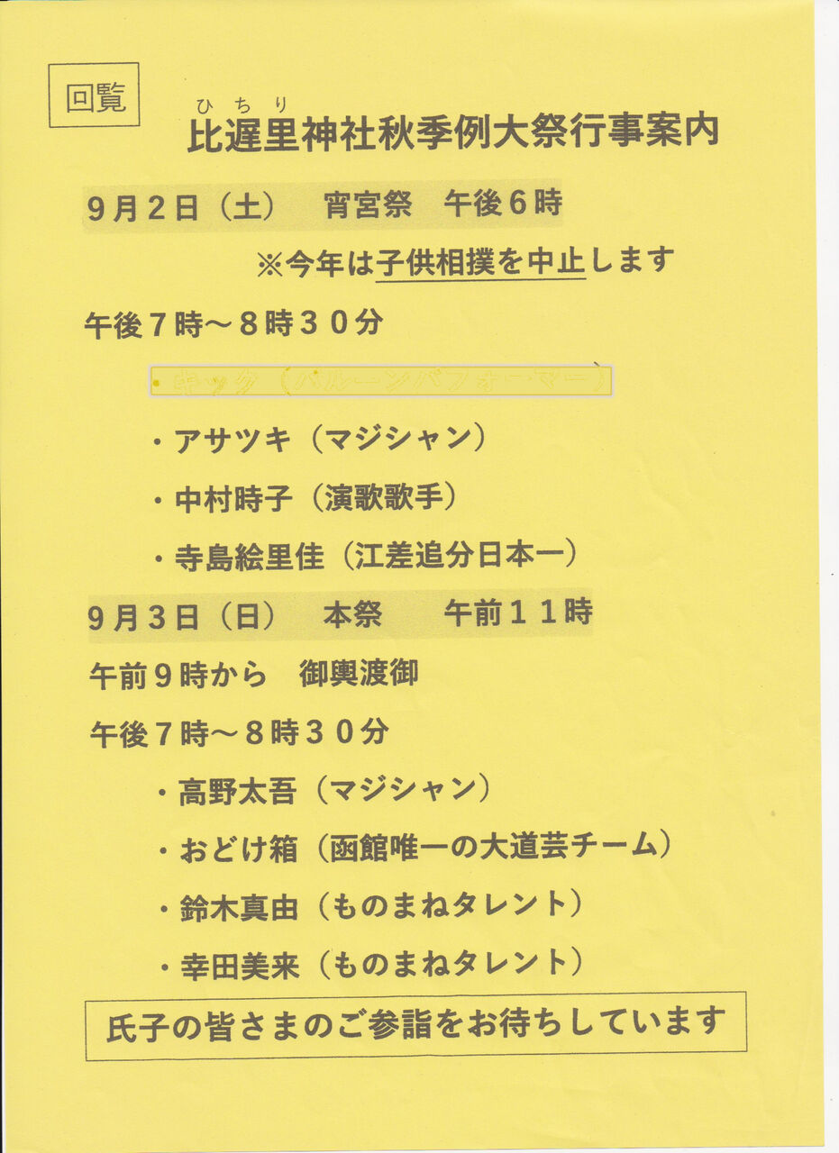 2023年08月30日 令和5年 比遅里神社秋季例大祭開催のお知らせ 国道5号線沿いの「比遅里神社」で9月2日(土)宵宮祭~9月3日(日)本祭と、2日間秋季例大祭が開催されます。 3日午前9時から御輿渡御が予定されていて、例年神社を出発して国道5号線を練り歩いてます。 今年は子ども相撲は中止だそうで、残念ですね。催事プログラムの一部訂正をいたしました タグ :#比遅里神社#例大祭#渡御#マジック#寺島絵里佳#中村時子#アサツキ#キック#高野太吾#おどけ箱 「町会行事予定」カテゴリの最新記事 < 前の記事次の記事 > コメント コメント一覧 桔梗町会広報部 2023年08月30日 10:51 ご指摘いただきましたので、画像の訂正を行いました。 町会宛に祭典についてのプログラム・チラシをいただいたため掲載しましたが、直接関わっておらず詳細については承知しておりませんので悪しからずご了承願います。広報部 バルーンパフォーマーキック 2023年08月29日 23:36 私、今年呼ばれてませんが………🤣 コメントフォーム 名前 コメント 記事の評価 リセット リセット 顔 星 情報を記憶 コメントを投稿する