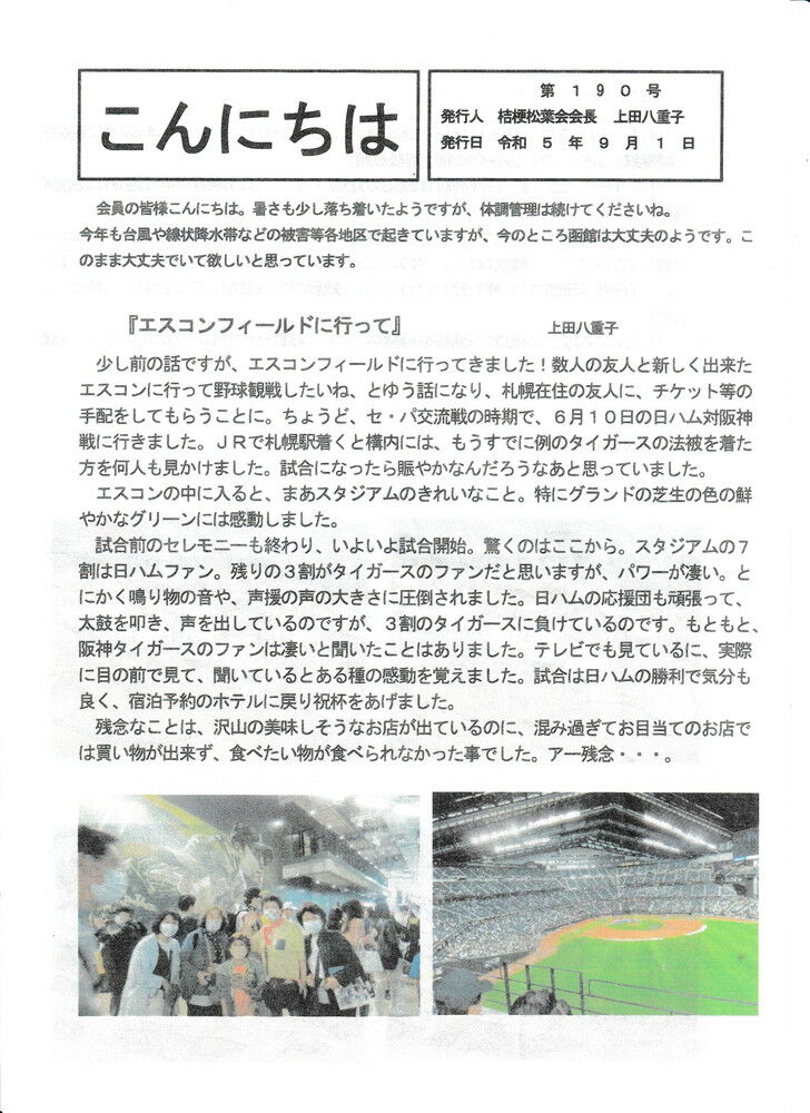 2023年09月11日 松葉会広報紙「こんにちは」第190号発行 桔梗町の老人クラブ「松葉会」(上田八重子会長)で広報紙「こんにちは」第190号を9月1日に発行しました。 タグ :#函館市#桔梗町#松葉会#老人クラブ#広報紙#190号#エスコンフィールド#にこやかサロン 「各区の行事など」カテゴリの最新記事 < 前の記事次の記事 > コメント コメントフォーム 名前 コメント 記事の評価 リセット リセット 顔 星 情報を記憶 コメントを投稿する