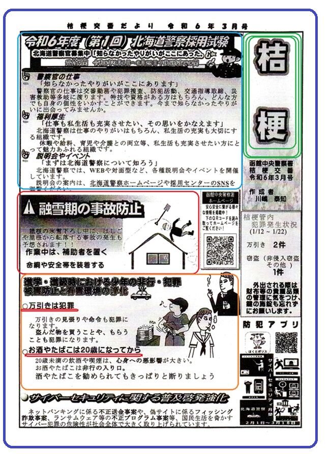 2024年02月28日 「桔梗交番だより 3月号」(2024-02-20) 「桔梗交番だより 3月号」(2024-02-20)が寄せられました◎「融雪期の事故防止!!」 ◎「万引きは犯罪!」◎「お酒・たばこは20歳になってから!!」 「交通安全部」カテゴリの最新記事 < 前の記事次の記事 > コメント コメントフォーム 名前 コメント 記事の評価 リセット リセット 顔 星 情報を記憶 コメントを投稿する