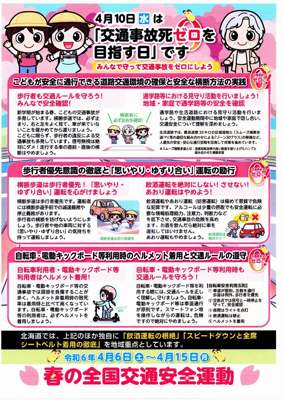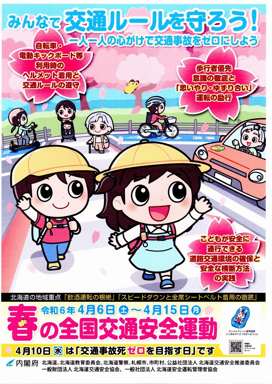 2024年04月01日 「春の全国交通安全運動」が始まります 4月6日(土)~4月15日(月) 「春の全国交通安全運動」が始まります かわいい新入生を見かける時期です 安全運転をお願いします◎「子供が安全に通行できる環境確保と 安全な横断方法の実践」◎「歩行者優先の意識と思いやり運転の励行」 ◎「自転車のヘルメット着用と 交通ルールの徹底」☆ 「飲酒運転の根絶」☆「スピードダウンと全席シートベルト着用」自転車事故の備えは充分ですか?現在、皆さま御加入中の保険に 「自転車事故の特約」が有りますか?自転車事故による 「高額の損害賠償事故が発生しています!!」 「交通安全部」カテゴリの最新記事 < 前の記事次の記事 > コメント コメントフォーム 名前 コメント 記事の評価 リセット リセット 顔 星 情報を記憶 コメントを投稿する