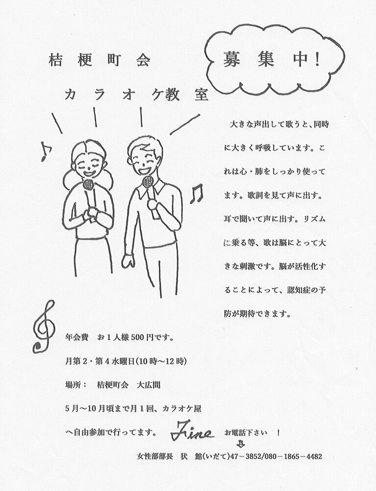 2024年06月24日 桔梗町会「カラオケ教室」ご案内 桔梗町会女性部(犾館部長)では「カラオケ教室」への参加者を募集しています。 町会員であればどなたでもご参加できます。 毎月、第2・第4水曜日・午前10時から12時まで桔梗町会館で行っております。ぜひご参加ください。 タグ :#函館市#桔梗町会#女性部#カラオケ#募集 「女性部」カテゴリの最新記事 < 前の記事次の記事 > コメント コメントフォーム 名前 コメント 記事の評価 リセット リセット 顔 星 情報を記憶 コメントを投稿する