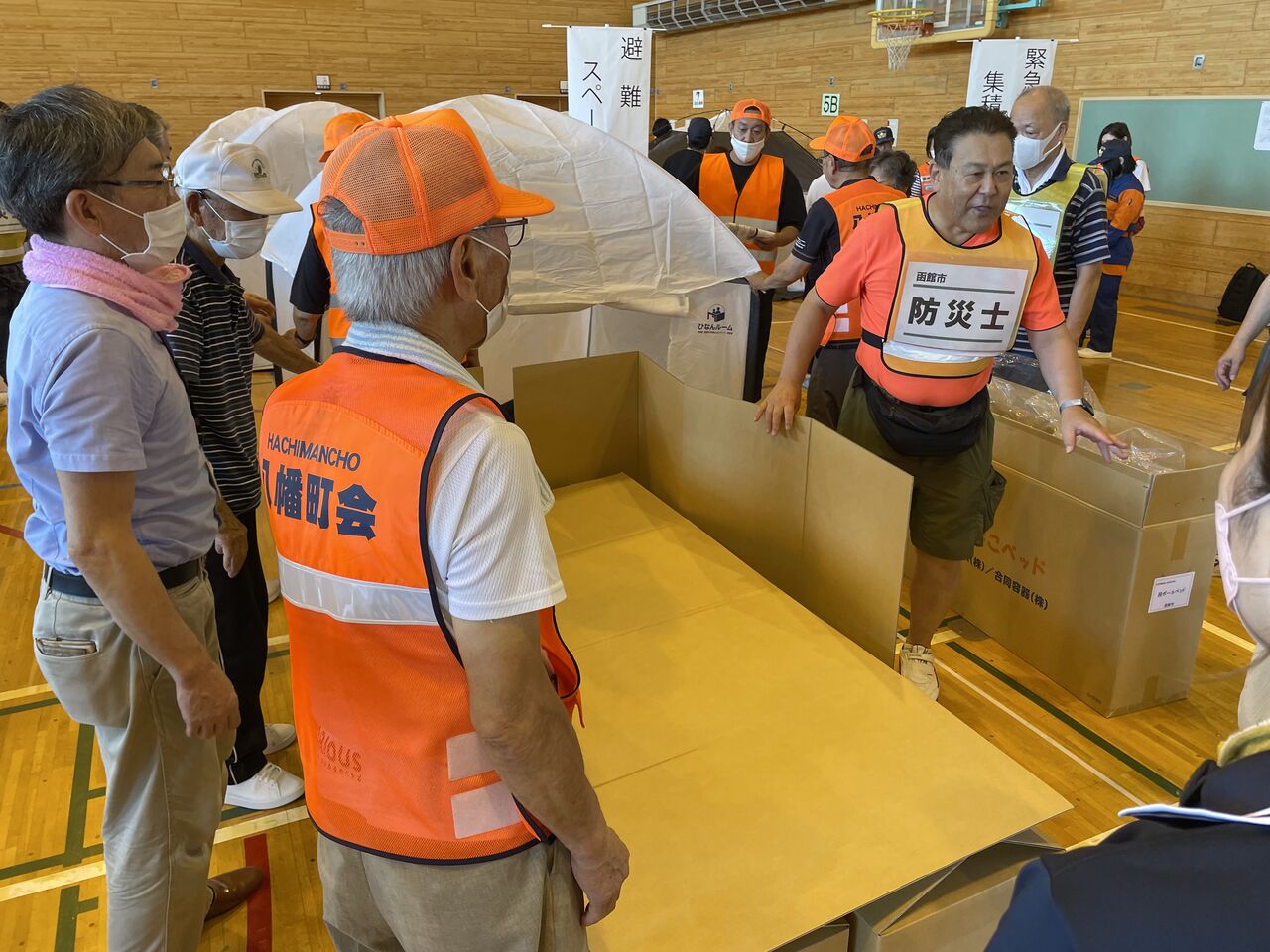体育館での避難者のご案内や、段ボールベッドや屋内テント
