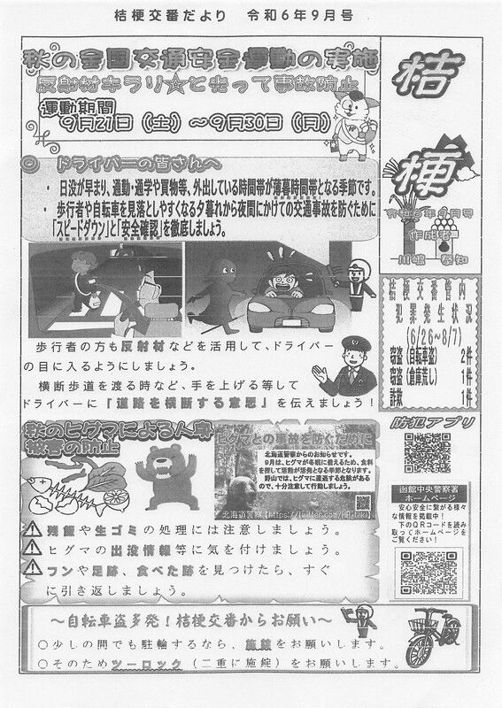 2024年08月22日 『桔梗』交番よりお知らせ 桔梗交番より「桔梗」8月9月号のご案内です。 タグ :#函館市#桔梗#交番#回覧#交通安全#ヒグマ#出没情報#自転車#安全 「広報部」カテゴリの最新記事 < 前の記事次の記事 > コメント コメントフォーム 名前 コメント 記事の評価 リセット リセット 顔 星 情報を記憶 コメントを投稿する