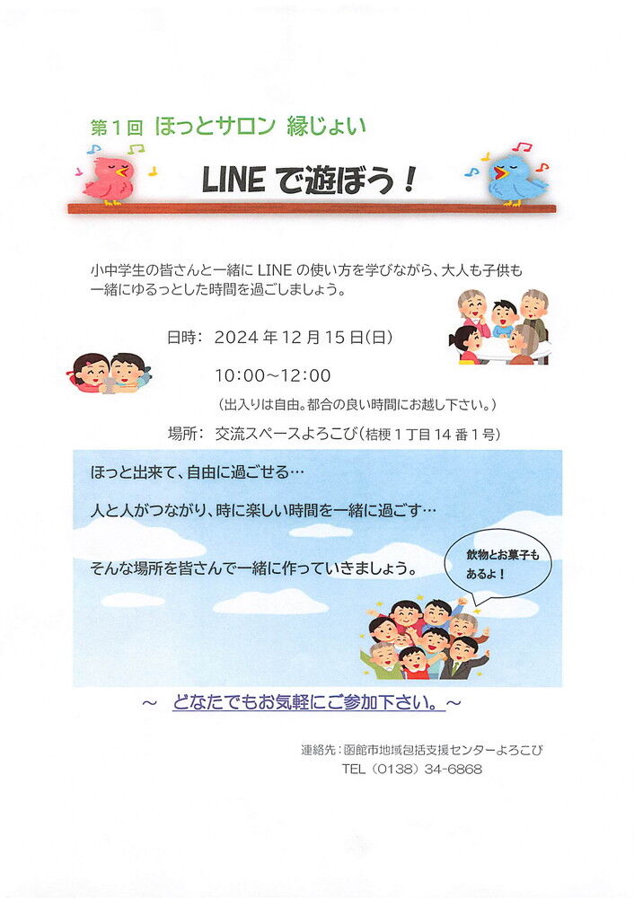 2024年11月23日 第1回ほっとサロン 縁じょい LINEで遊ぼう! 12月15日(日)10時から12時「地域包括支援センターよろこび」では、大人と子どもと一緒にLLINEの使い方を学んでもらおうと、施設内の「交流スペースよろこび」で「LINEで遊ぼう!」を開催します。出入りは自由、都合の良い時間に気軽に参加できるそうです。興味のある方は参加してみては・・。画像をクリックすると拡大できます タグ :#LINE#遊ぼう#ほっとサロン#包括支援センター#よろこび#桔梗町#交流#親子#大人#こども 「地域の活動や行事」カテゴリの最新記事 < 前の記事次の記事 > コメント コメントフォーム 名前 コメント 記事の評価 リセット リセット 顔 星 情報を記憶 コメントを投稿する