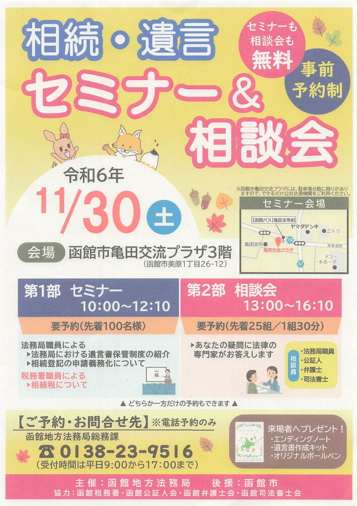 2024年11月24日 相続・遺言セミナー&相談会 11月30日(土)亀田交流プラザ3階で午前10時「第1部・セミナー」、13時~「第2部・相談会」が開催されます。クリックすると画像拡大できます タグ :#相続#遺言#セミナー#相談会#亀田交流プラザ#函館市#地方法務局 「地域の活動や行事」カテゴリの最新記事 < 前の記事次の記事 > コメント コメントフォーム 名前 コメント 記事の評価 リセット リセット 顔 星 情報を記憶 コメントを投稿する