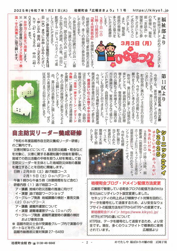 2025年01月23日 広報ききょう11号発行 令和7年1月21日(火)桔梗町会広報紙『広報ききょう』11号を発行しました。 新年1月発行ということで、会長、部長、区長さんからの新年のご挨拶や、抱負などについて記事を掲載いたしました。 タグ :#広報紙#ききょう#函館市#桔梗町#令和7年#新年号#ブログ#女性部#福祉部 「広報部」カテゴリの最新記事 < 前の記事次の記事 > コメント コメントフォーム 名前 コメント 記事の評価 リセット リセット 顔 星 情報を記憶 コメントを投稿する
