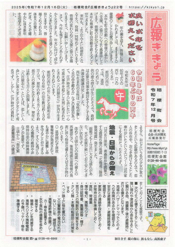 2025年12月18日 「広報ききょう」22号(令和7年12月) 12月16日(火)『広報ききょう』第22号発行・良いお年をお迎えください・令和8年は60年ぶりの丙午(ひのえうま)・地震・日頃からの備え・・老人クラブ「桔梗松葉会・終活セミナー」・桔梗松葉会の存続危機・林業試験場にオオタカ・ 桔梗町会館前の屋外掲示板が損壊・余儀なく交換設置 タグ :#函館市#桔梗町#広報#ききょう#松葉会#林業試験場#屋外掲示板#令和8年#丙午#自身 「広報部」カテゴリの最新記事 < 前の記事次の記事 > コメント コメントフォーム 名前 コメント 記事の評価 リセット リセット 顔 星 情報を記憶 コメントを投稿する