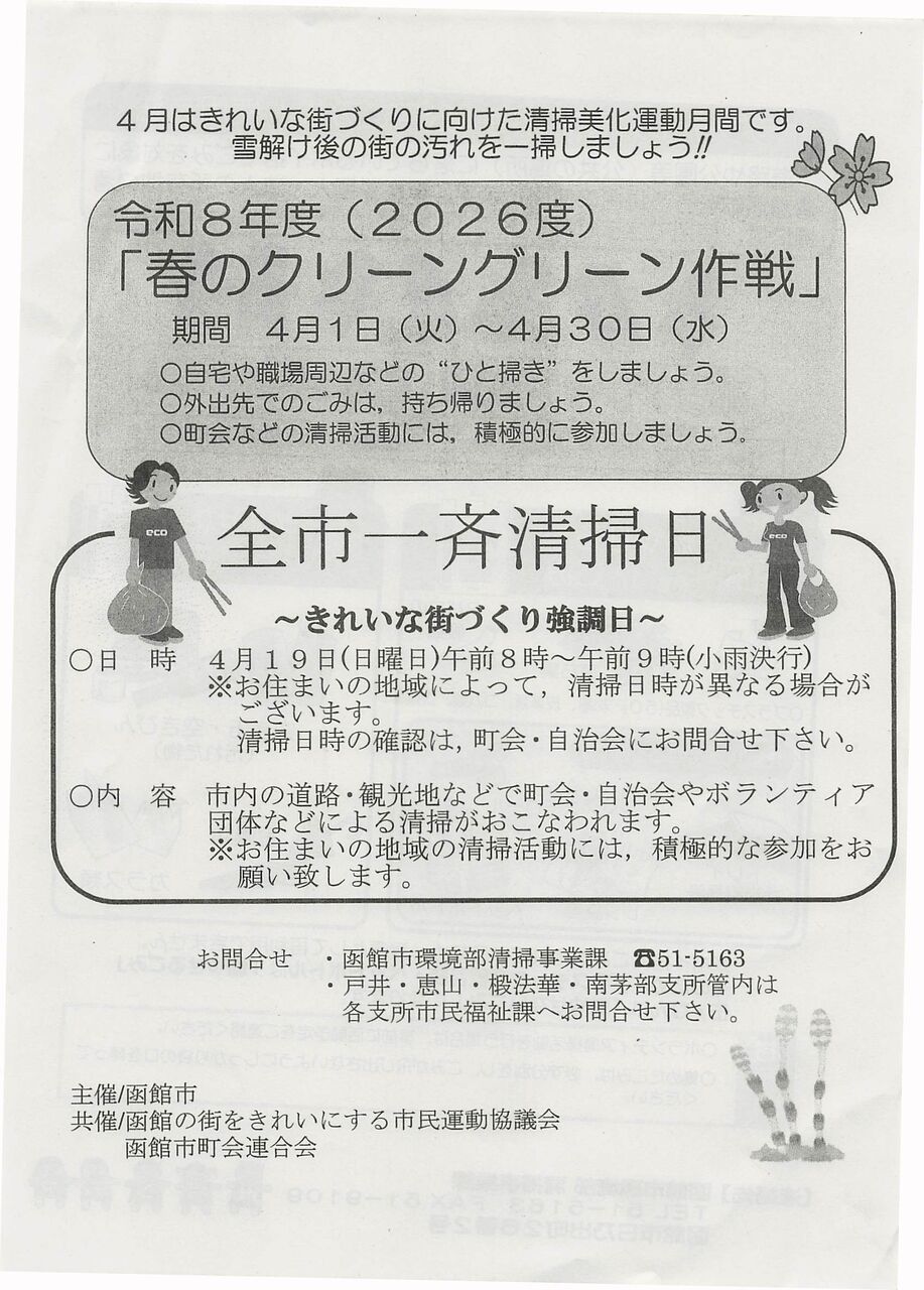 2026年03月26日 春のクリーン・グリーン作戦(回覧) 2026年春の全市一斉清掃日4月1日~4月30日きれいな街づくり・雪解け後の街の汚れを一掃しよう! タグ :#函館市#クリーン#グリーン作戦#一斉清掃#街づくり#ごみ一掃 「広報部」カテゴリの最新記事 < 前の記事次の記事 > コメント コメントフォーム 名前 コメント 記事の評価 リセット リセット 顔 星 情報を記憶 コメントを投稿する